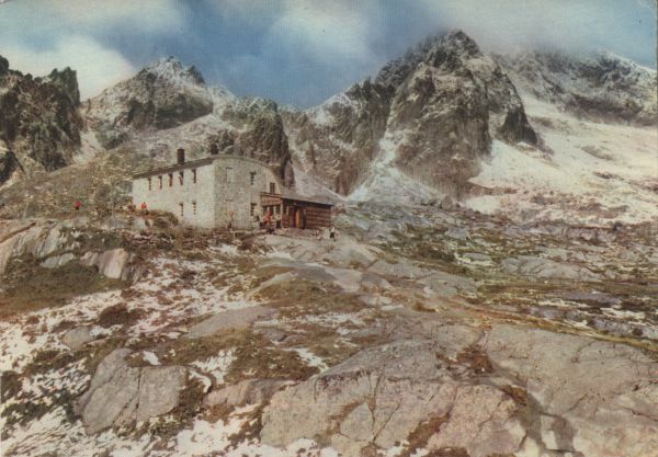 Tatrzański Park Narodowy [Słowacja] - Dolina Małej Zimnej Wody, schronisko Téryego. Od lewej: Sp±ga, Mały Lodowy Szczyt i Lodowa Kopa. Tytuł również w języku: ros., ang., niem.