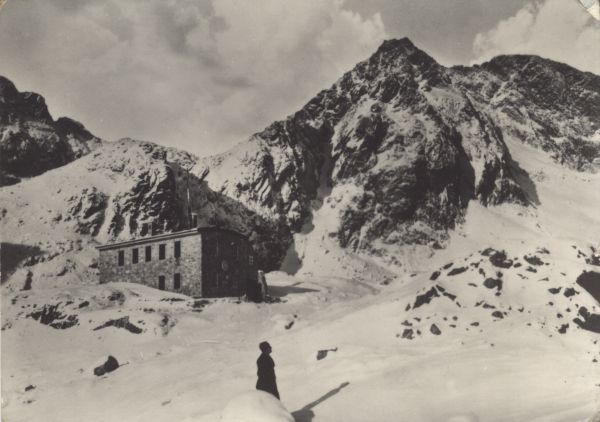 Schronisko Téryego w Dolinie Pięciu Stawów Spiskich w scenerii zimowej. Na pierwszym planie turysta. W tle Mały Lodowy Szczyt, Pięciostawiańska Kopa, Lodowa Kopa i Lodowy Szczyt.