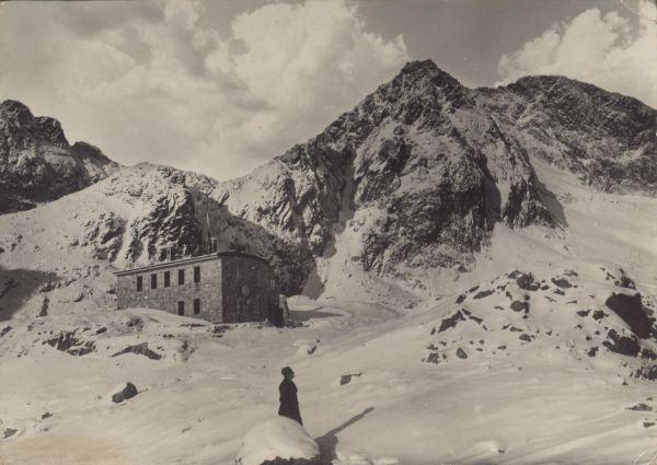 Schronisko Téryego w Dolinie Pięciu Stawów Spiskich w scenerii zimowej. Na pierwszym planie turysta. W tle Mały Lodowy Szczyt, Pięciostawiańska Kopa, Lodowa Kopa i Lodowy Szczyt.
