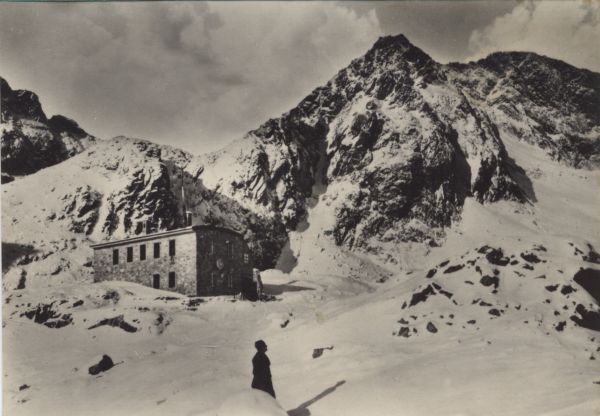 Schronisko Téryego w Dolinie Pięciu Stawów Spiskich w scenerii zimowej. Na pierwszym planie turysta. W tle Mały Lodowy Szczyt, Pięciostawiańska Kopa, Lodowa Kopa i Lodowy Szczyt.