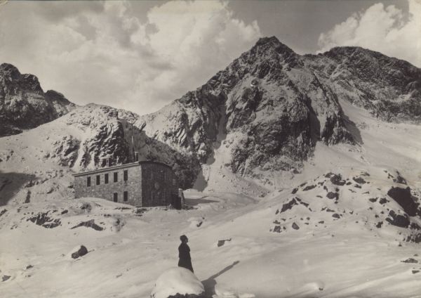 Schronisko Téryego w Dolinie Pięciu Stawów Spiskich w scenerii zimowej. Na pierwszym planie turysta. W tle Mały Lodowy Szczyt, Pięciostawiańska Kopa, Lodowa Kopa i Lodowy Szczyt.