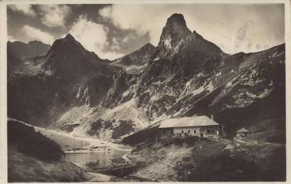 Widok na schronisko przy Zielonym Stawie Kieżmarskim. Przed schroniskiem grupa turystów. W tle Czarny Szczyt, Kołowy Szczyt i Jastrzębia Turnia.