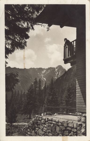 Widok na Sławkowski Szczyt ze schroniska Stefana Zamkowskiego. Na balkonie schroniska widoczny mężczyzna.