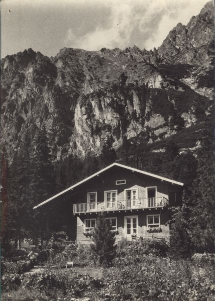 Widok na schronisko Zamkowskiego (okresowo kpt. Nalepki) w Dolinie Małej Zimnej Wody. W tle Łomnicka Grań.