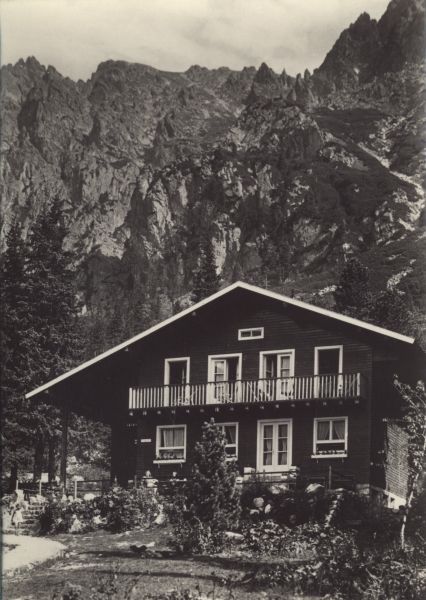 Widok na schronisko Zamkowskiego (okresowo kpt. Nalepki) w Dolinie Małej Zimnej Wody. W tle Łomnicka Grań. Na tarasie przed schroniskiem siedzą 2 osoby, przy schodach stoi dziewczynka.