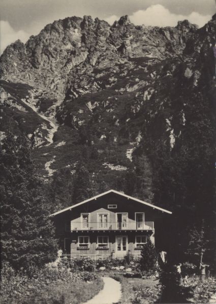 Widok na schronisko Zamkowskiego (okresowo kpt. Nalepki) w Dolinie Małej Zimnej Wody. W tle Łomnicka Grań.