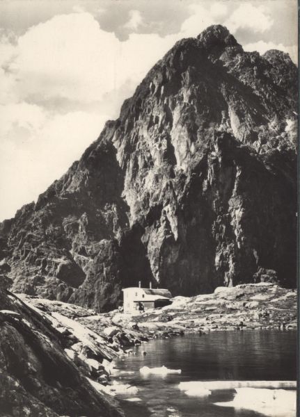 Schronisko Téryego w Dolinie Pięciu Stawów Spiskich. Na pierwszym planie Pośredni Staw Spiski. W tle Pośrednia Grań i Żółty Szczyt.
