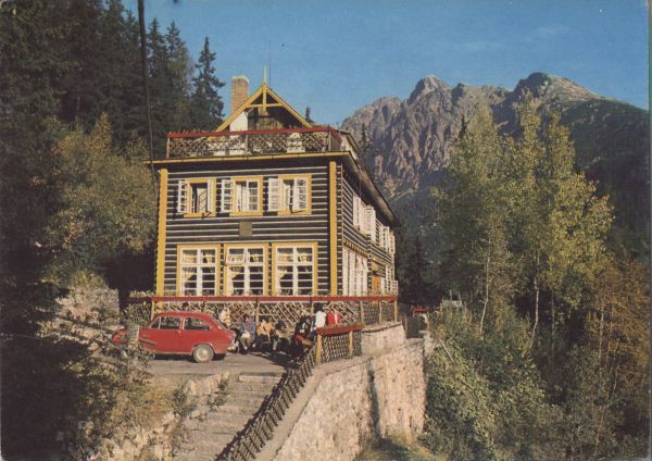 Schronisko Pavla Bilika pod Siodełkiem. Przed schroniskiem grupa turystów i zaparkowany samochód. W tle Łomnica i Kieżmarski Szczyt.