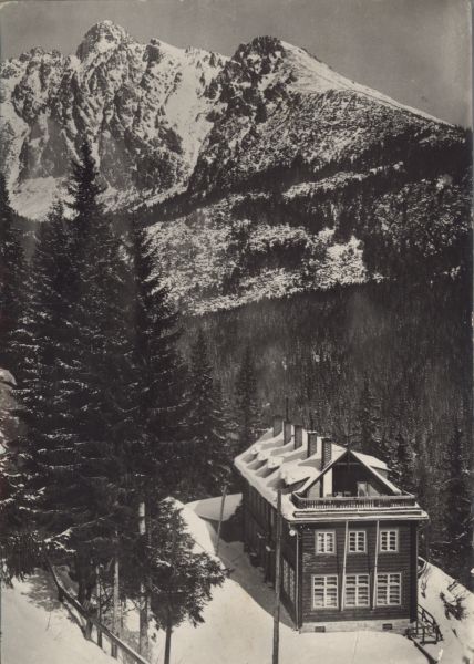 Widok na Schronisko Pavla Bilika pod Siodełkiem w scenerii zimowej. Po lewej stronie świerki (Picea A. Dietr.). W tle Łomnica, Kieżmarski Szczyt i Huncowski Szczyt.