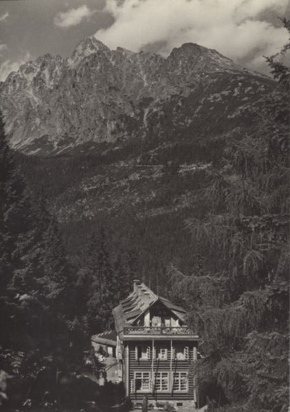 Schronisko Pavla Bilika pod Siodełkiem. Na pierwszym planie modrzew (Larix Mill) i świerki (Picea A. Dietr.). W tle Łomnica i Kieżmarski Szczyt.