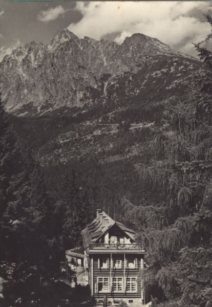 Schronisko Pavla Bilika pod Siodełkiem. Na pierwszym planie modrzew (Larix Mill) i ¶wierki (Picea A. Dietr.). W tle Łomnica i Kieżmarski Szczyt.