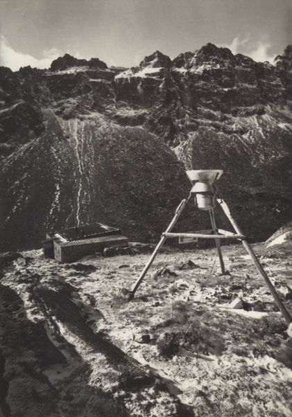 Widok na schronisko Zbójnickie w Dolinie Staroleśnej. W tle Sławkowska Grań i Nowoleśna Grań. Na pierwszym planie totalizator (przyrząd meteorologiczny do pomiaru sum opadów atmosferycznych).
