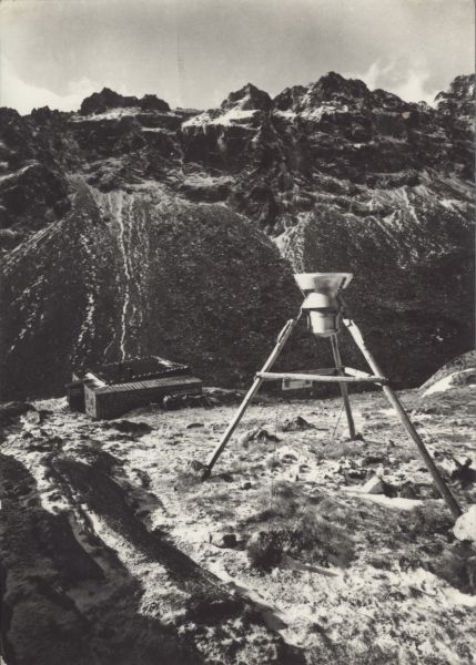 Widok na schronisko Zbójnickie w Dolinie Staroleśnej. W tle Sławkowska Grań i Nowoleśna Grań. Na pierwszym planie totalizator (przyrząd meteorologiczny do pomiaru sum opadów atmosferycznych).