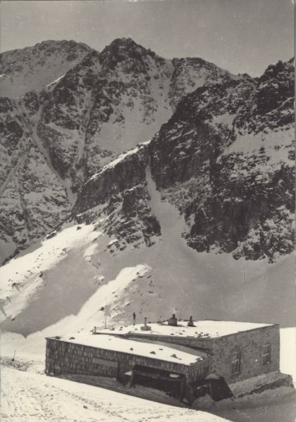 Widok na schronisko Zbójnickie w Dolinie Staroleśnej w scenerii zimowej. W tle od lewej: Sławkowski Szczyt, Sławkowska Kopa i Grań Skrajnej Nowoleśnej Turni.