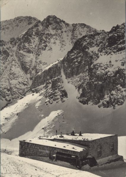 Widok na schronisko Zbójnickie w Dolinie Staroleśnej w scenerii zimowej. W tle od lewej: Sławkowski Szczyt, Sławkowska Kopa i Grań Skrajnej Nowoleśnej Turni.