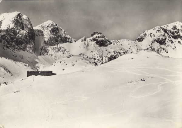 Widok na schronisko Zbójnickie w Dolinie Staroleśnej w scenerii zimowej. W tle Baniasta Turnia, Mała Wysoka, Rohatka, Dzika Turnia, Świstowy Szczyt.