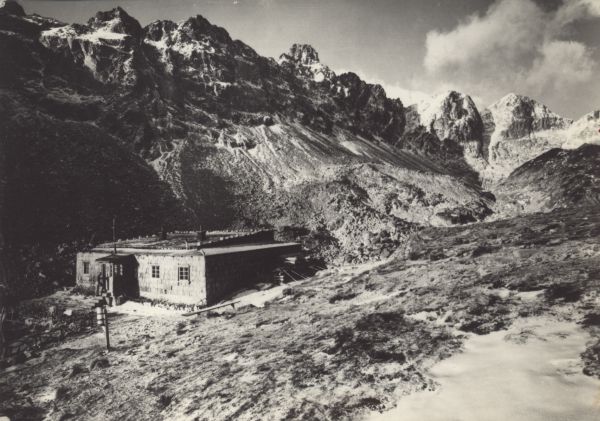 Tatrzański Park Narodowy [Słowacja]. Dolina Staroleśna. Zbójnickie schronisko, w tle od lewej: grań Warzęchowych Turni, Staroleśny Szczyt, Baniasta Turnia, Mała Wysoka i przełęcz Rohatka.