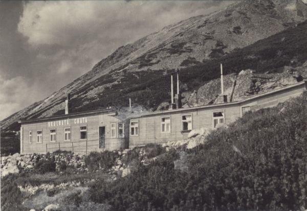 Widok na schronisko Łomnickie przy Łomnickim Stawie. Na pierwszym planie kosodrzewina (Pinus mugo Turra). W tle zbocze Łomnicy.