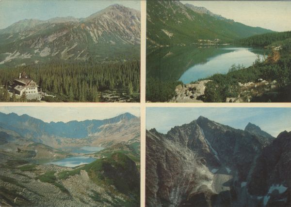Cztery zdjęcia przedstawiaj±ce krajobrazy z Tatr Wysokich: Hala G±sienicowa ze schroniskiem Murowaniec, Dolina Pięciu Stawów Polskich, Morskie Oko oraz Rysy.