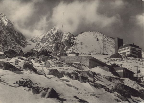 Widok na schronisko £omnickie i Hotel Encián w scenerii zimowej. W tle £omnica, Kie¿marski Szczyt i Huncowski Szczyt.