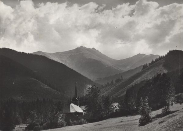 Jaworzyna. W tle masyw Szerokiej Jaworzyńskiej. Na pierwszym planie kościółek ufundowany przez Christiana Hohenlohe.