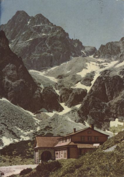 Tatry Wysokie. Schronisko Brnčala w Dolinie Zielonego Stawu Kieżmarskiego. Od lewej: Durny Szczyt i Pyszny Szczyt. Tytuł również w języku: ros., ang., niem.