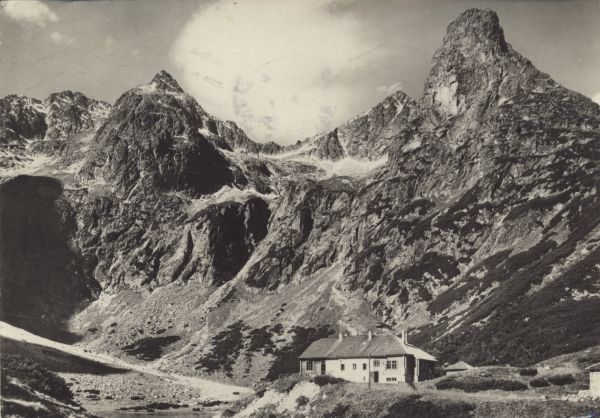 Widok na schronisko przy Zielonym Stawie Kieżmarskim. W tle Baranie Rogi, Czarny Szczyt, Kołowy Szczyt i Jastrzębia Turnia.