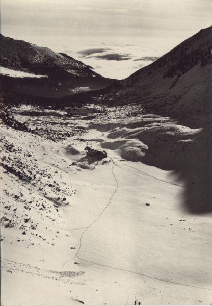 Widok na schronisko przy Zielonym Stawie Kieżmarskim w scenerii zimowej. Na pierwszym planie zasypany śniegiem Zielony Staw Kieżmarski. W tle morze mgieł.