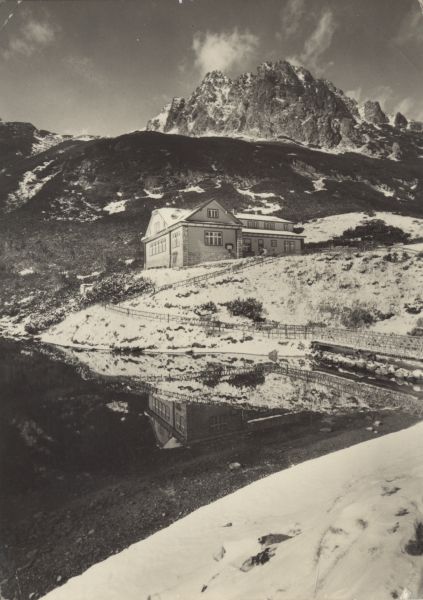 VYSOKÉ TATRY Pohľad od Zeleného plesa Kežmarského (1545 m) na Brnčalovu chatu (1554 m). V pozadí Kozí štít (2107 m) nad Červenou dolinou
