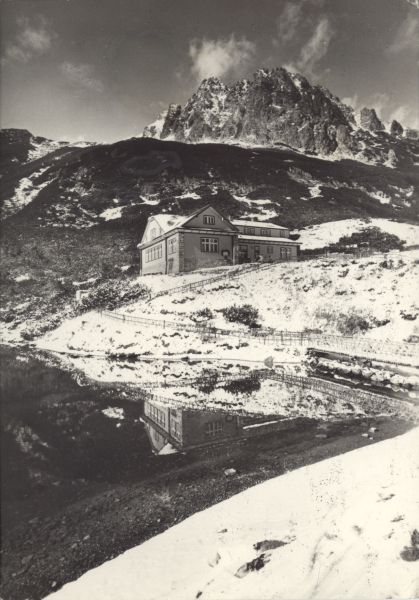 Widok na schronisko im. Alberta Brnčala, odbijającego się w tafli Zielonego Stawu Kieżmarskiego. W tle Kozie Turnie nad Doliną Jagnięcą.