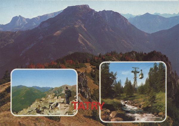 Widokówka 3. elementowa. Główne zdjęcie przedstawia Kominiarski Wierch widziany z rejonu Bobrowca. Miniaturki zdjęć przedstawiają