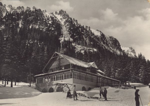 Zimowy widok na schronisko Kozica u podnóża Sławkowskiego Szczytu w Dolinie Zimnej Wody. Na pierwszym planie narciarze.
