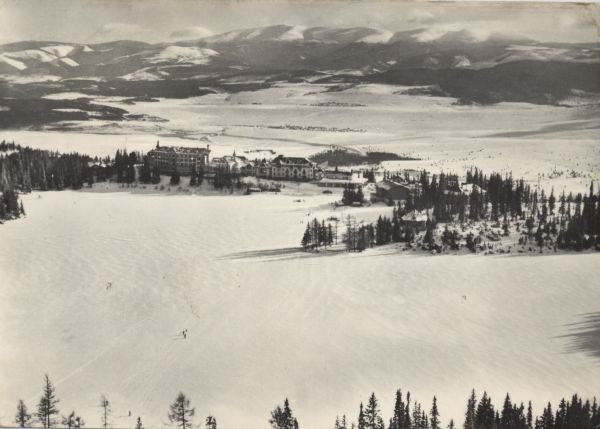 Zimowy widok na skute lodem Szczyrbskie Jezioro otoczone lasem i zabudowania hotelowo sanatoryjne na jego brzegu. W tle Kotlina Liptowska i Niżne Tatry.