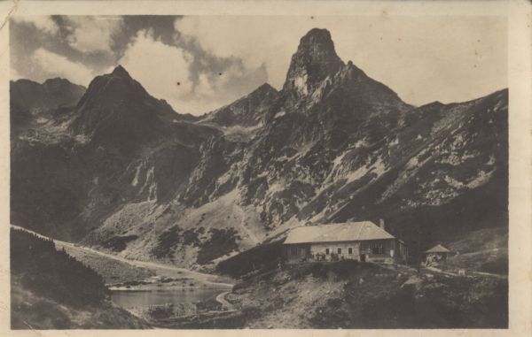 Widok na schronisko przy Zielonym Stawie Kieżmarskim. Przed schroniskiem grupa turystów. W tle Baranie Rogi, Czarny Szczyt, Kołowy Szczyt i Jastrzębia Turnia.