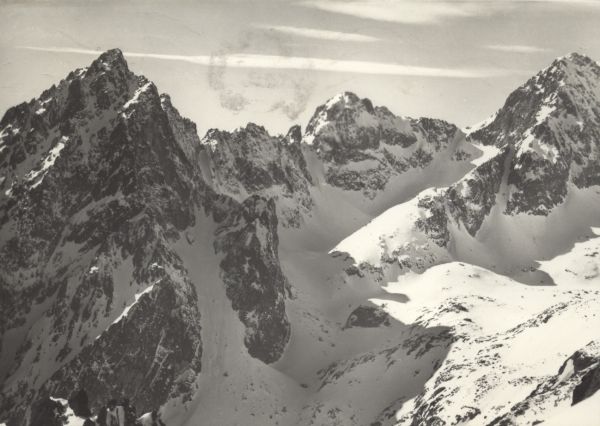 Tatry Wysokie. Widok z Łomnicy na zachód ponad Doliną Małej Zimnej Wody. Na horyzoncie Gerlach, Wysoka, Krywań. [Błędny opis szczytów. Na zdjęciu od lewej Pośrednia Grań, Mały Lodowy Szczyt i Lodowa Kopa.]
