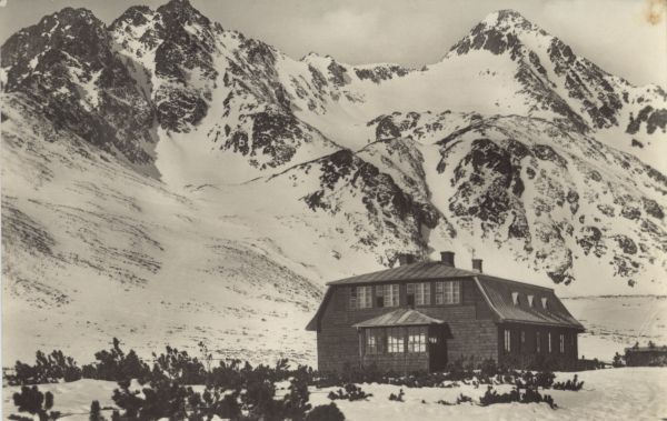 Widok na schronisko Kieżmarskie w Dolinie Białych Stawów w scenerii zimowej. Na pierwszym planie kosodrzewina (Pinus mugo Turra). W tle Rzeżuchowe Turnie, Kozia Turnia i Jagnięcy Szczyt.