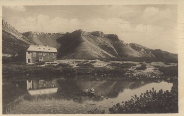 Widok na schronisko Kieżmarskie, odbijające się w tafli Wielkiego Białego Stawu w Dolinie Białych Stawów. Na pierwszym planie Wielki Biały Staw, wokół niego zarośla kosodrzewiny (Pinus mugo Turra). W tle szczyty Tatr Bielskich, od lewej: Jatki, Golica Bielska, Bujaczy Wierch, Rakuski Grzbiet.