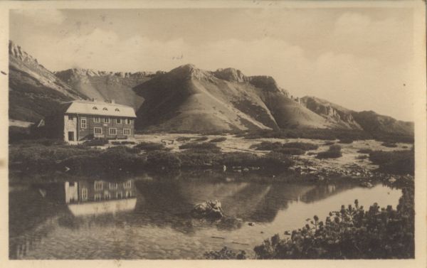 Widok na schronisko Kieżmarskie, odbijające się w tafli Wielkiego Białego Stawu w Dolinie Białych Stawów. Na pierwszym planie Wielki Biały Staw, wokół niego zarośla kosodrzewiny (Pinus mugo Turra). W tle szczyty Tatr Bielskich, od lewej: Jatki, Golica Bielska, Bujaczy Wierch, Rakuski Grzbiet.