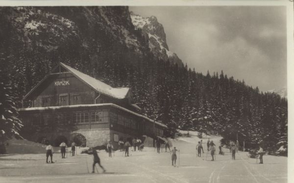 Zimowy widok na schronisko pod Kozicą u podnóża Sławkowskiego Szczytu na Polanie Staroleśnej w Dolinie Zimnej Wody. Na pierwszym planie narciarze.