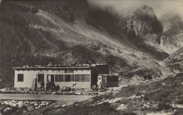 Widok na schronisko Zbójnickie w Dolinie Staroleśnej. Przed schroniskiem widać 6 osób. W tle Baniasta Turnia.