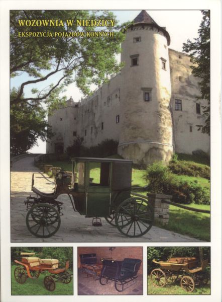 Wozownia w Niedzicy. Pocztówka 4. elementowa. Na kolejnych zdjęciach przedstawiono: Kareta coupé na tle zamku