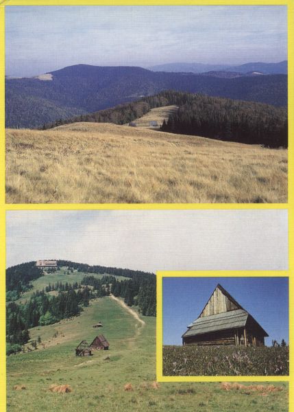 Pocztówka 3. elementowa. Na kolejnych zdjęciach przedstawiono: Halę Długą pod Turbaczem