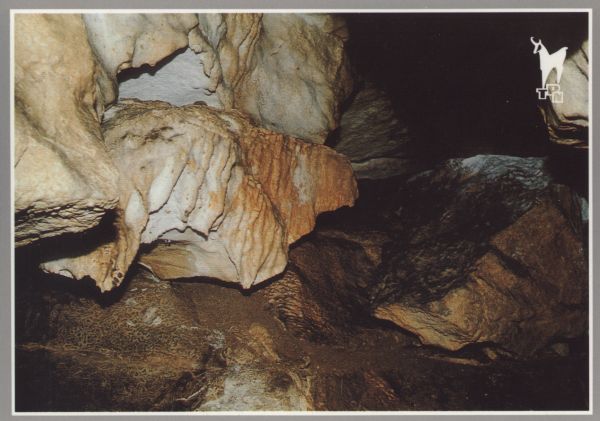 Utwory naciekowe we wnętrzu Jaskini Mroźnej w Dolinie Kościeliskiej. W prawym górnym rogu logo Tatrzańskiego Parku Narodowego.