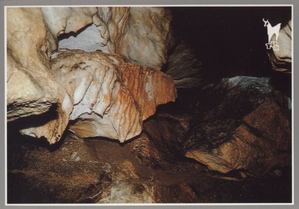 Utwory naciekowe we wnętrzu Jaskini Mroźnej w Dolinie Kościeliskiej. W prawym górnym rogu logo Tatrzańskiego Parku Narodowego.