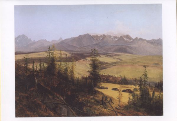 Reprodukcja obrazu Jana Nepomucena Głowackiego pt. Widok Tatr z Poronina. Na pierwszym planie las, w głębi zabudowania. W tle panorama Tatr.