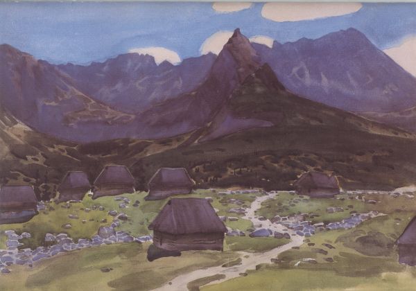 Reprodukcja akwareli Władysława Skoczylasa pt. Hala G±sienicowa. Na pierwszym planie szałasy na hali, w tle szczyty.