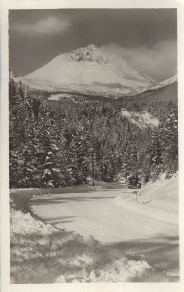 Widok na Gerlach z Tatrzańskiej Polanki w scenerii zimowej. Na pierwszym planie Droga Wolności, po której jedzie samochód. W głębi las.