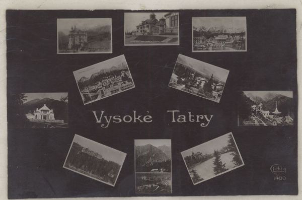 Pocztówka 10. elementowa. Na kolejnych zdjęciach przedstawiono: Obiekty hotelarsko sanatoryjne min.: Sanatoria Krywań i Hviezdoslav w Szczyrbskim Jeziorze, hotel Morawa w Tatrzańskiej Łomnicy
