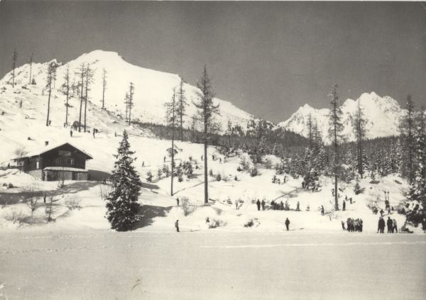 VYSOKÉ TATRY - Štrbské pleso (1351 m) Dolná stanica lyžiarskeho výťahu na Solisko. Vľavo Patria (2205 m), vpravo Vysoká (2565 m).