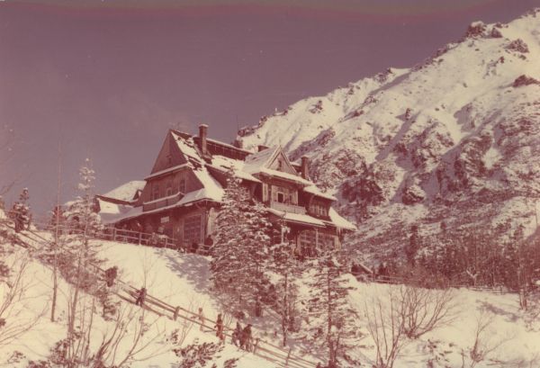 Widok na schronisko PTTK nad Morskim Okiem w scenerii zimowej. Przed schroniskiem turyści.